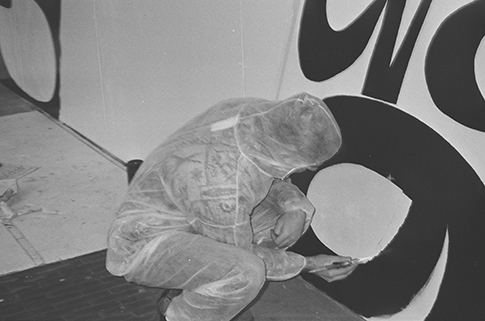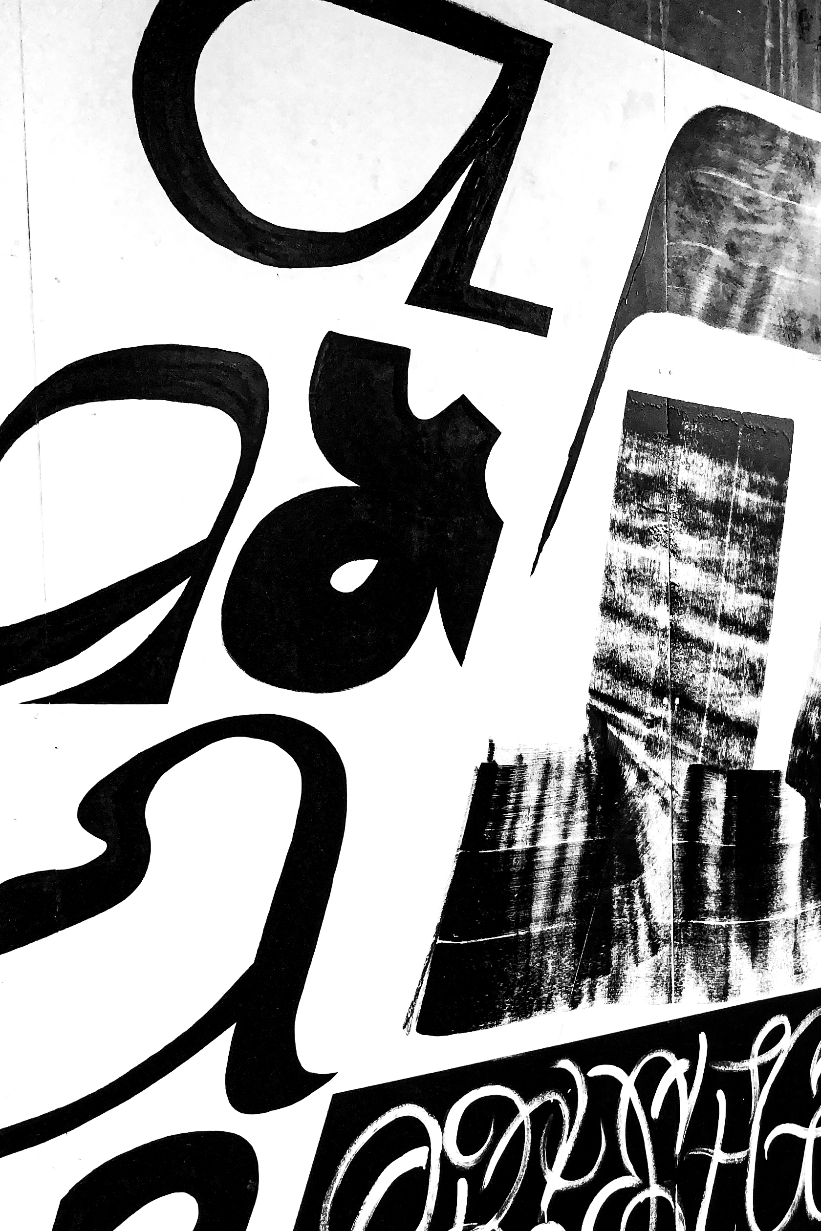Cette expérience se divise en deux parties : une première purement typographique, traditionnelle, réfléchie, dessinée et agencée en amont. Puis une partie d’essai purement pratique, instinctive et encadrée par une protocole. Cette seconde partie s’intéresse au geste ainsi que le rapport du corps à l’outil, et du traceur face à la surface.